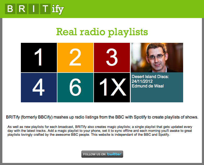 BRITify, a service that makes Spotify playlists out of BBC radio track lists, got a slick design update today. Here’s what it looks like now: